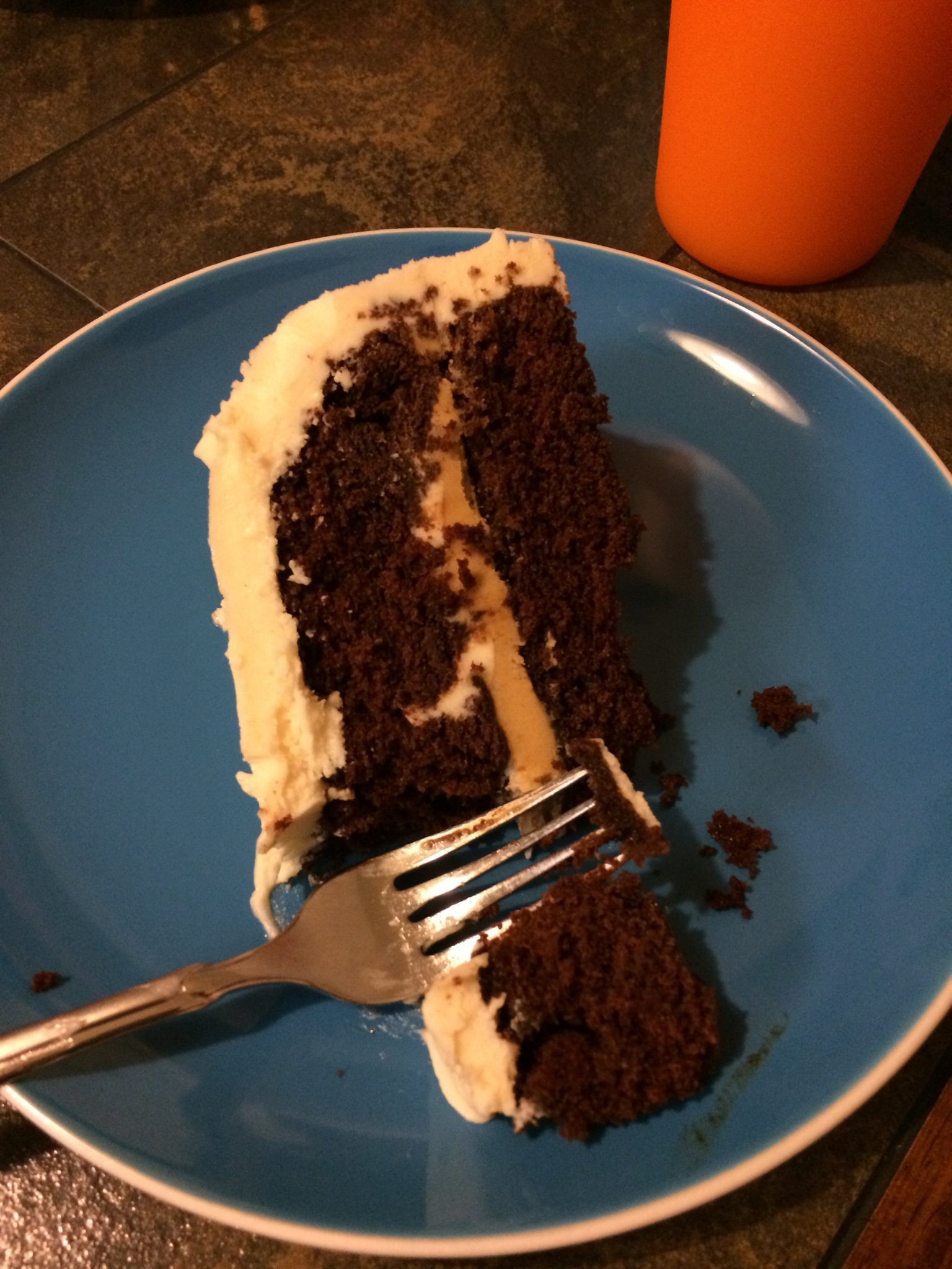 Putting it together was where I ran into a problem. I have learned my lesson – never try to lift and stack cakes without refrigerating them for a while first! Although I elicited help from the birthday boy, the top layer broke. Frosting saved it, but it’s certainly not my prettiest cake!