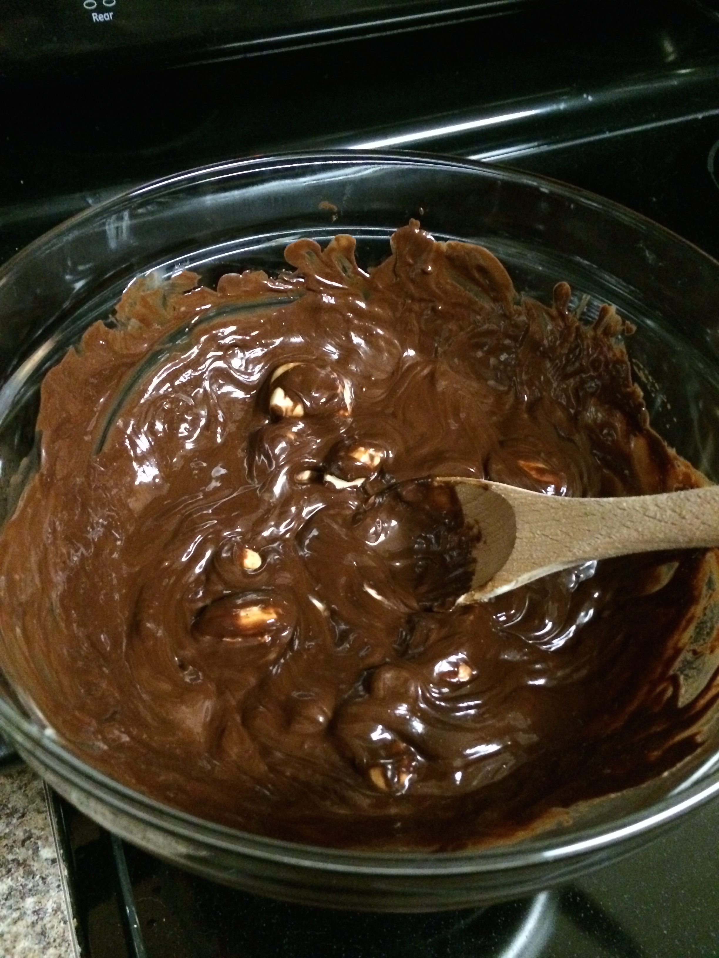 Then I melted the dark chocolate and the butter together. See those lovely bits of gold among the rich brownness? (Poetic, right?)