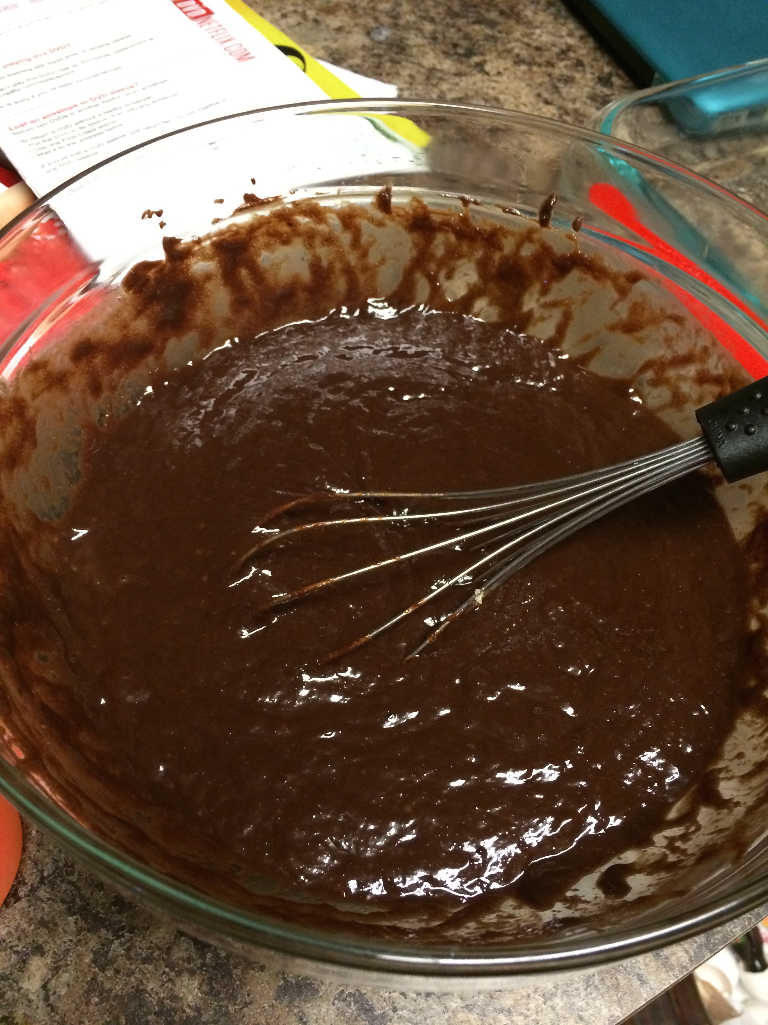 Once everything is all nicely melded, the eggs and sugars are mixed in. It’s starting to look like brownie now!