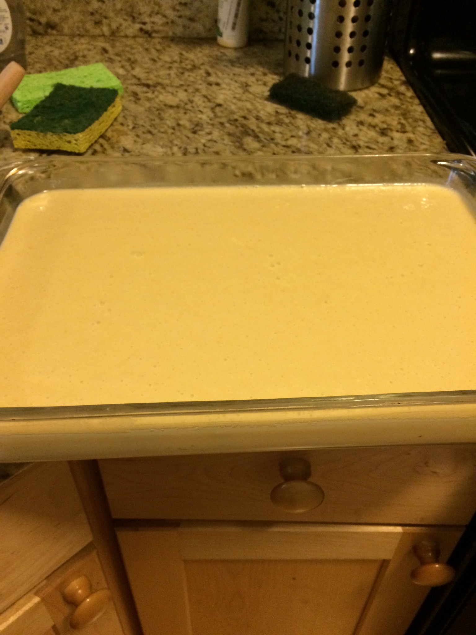 The first interesting thing about the cake is how it came together. The dry ingredients were mixed in a bowl, as usual. The eggs and sugar were combined in another bowl, and milk and butter were melted together and brought to a simmer on the stove. The dry ingredients were then mixed into the eggs and sugar, and the dairy products were added in last.