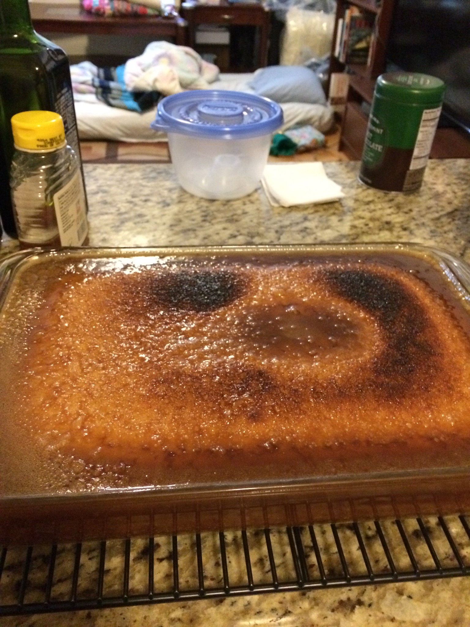 Butter was melted on the stove, then brown sugar, vanilla and rum were stirred in. The mixture was then poured over the still-warm cake, and the pan put back into the oven under the broiler for less than 2 minutes.