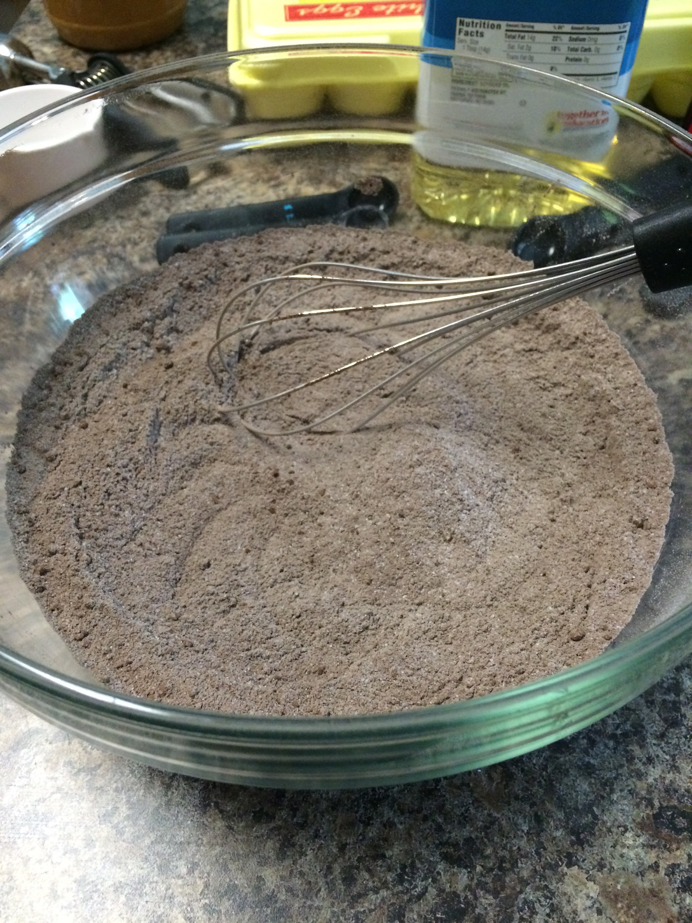 Whisk together the flour, baking powder, baking soda, and salt. Add in the sugar, then the cocoa powder.