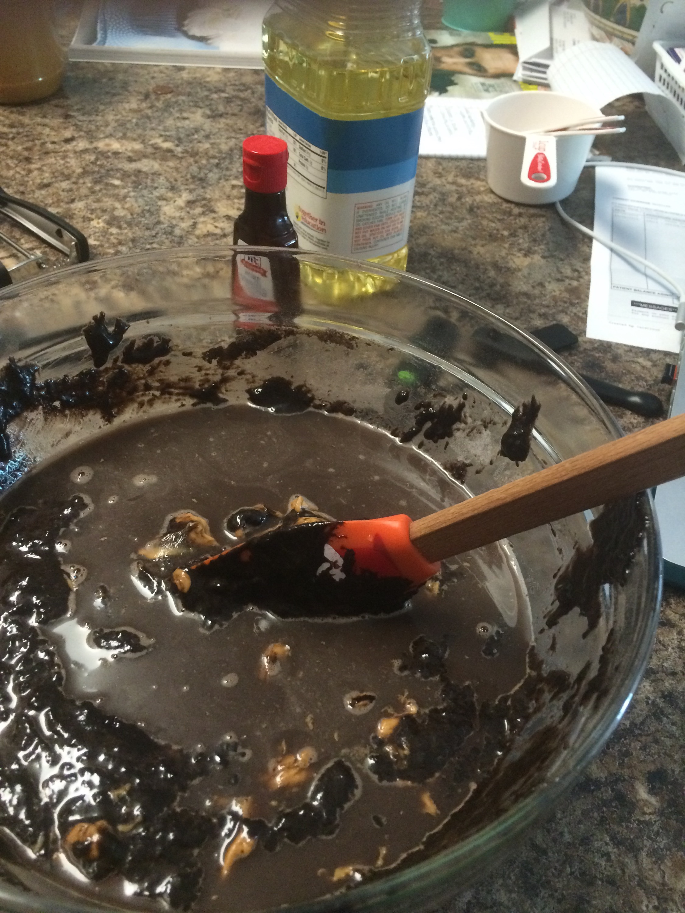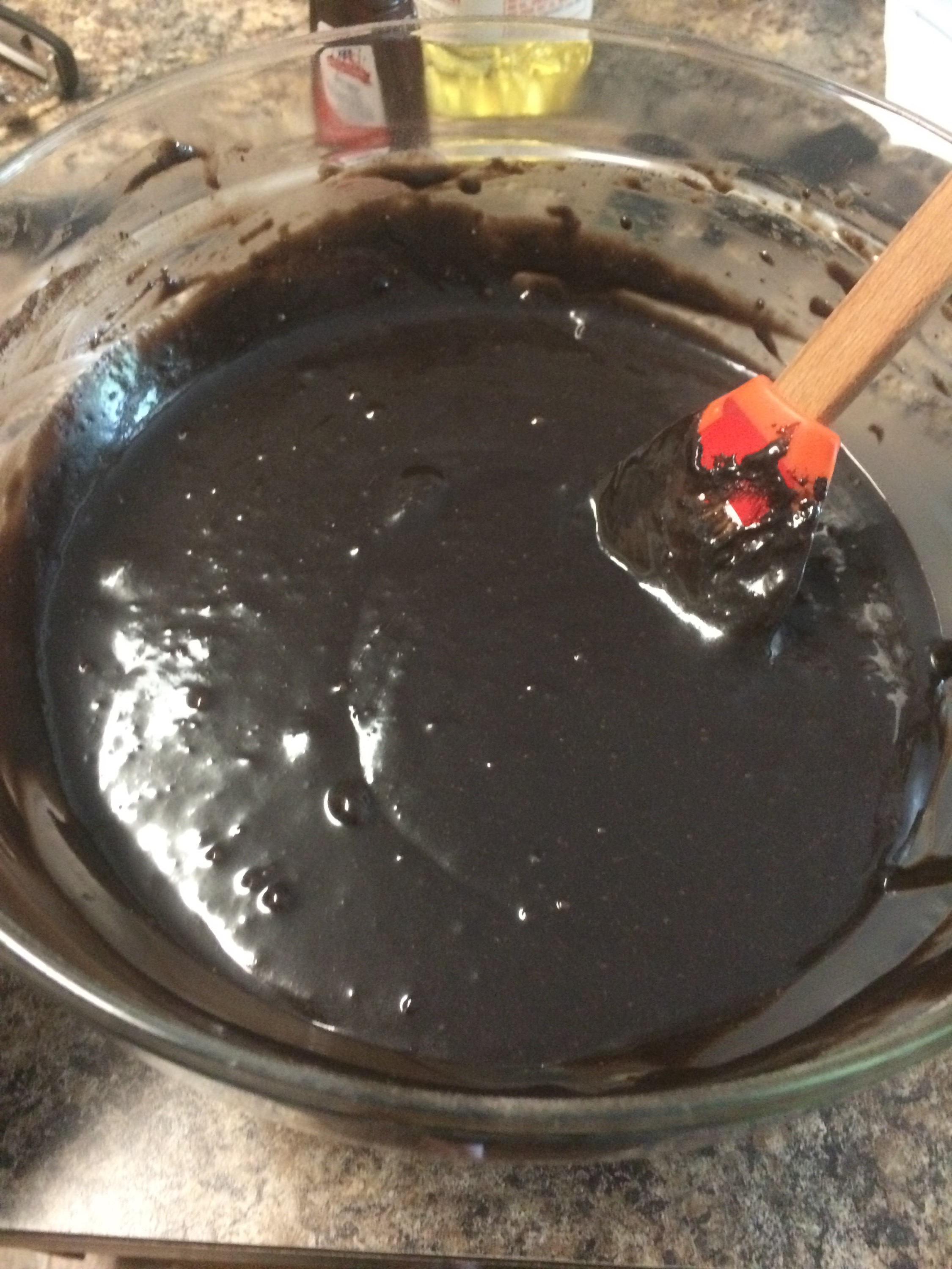Stir in eggs, buttermilk, oil, and vanilla. Add the peanut butter, then the water. Mix together until blended.