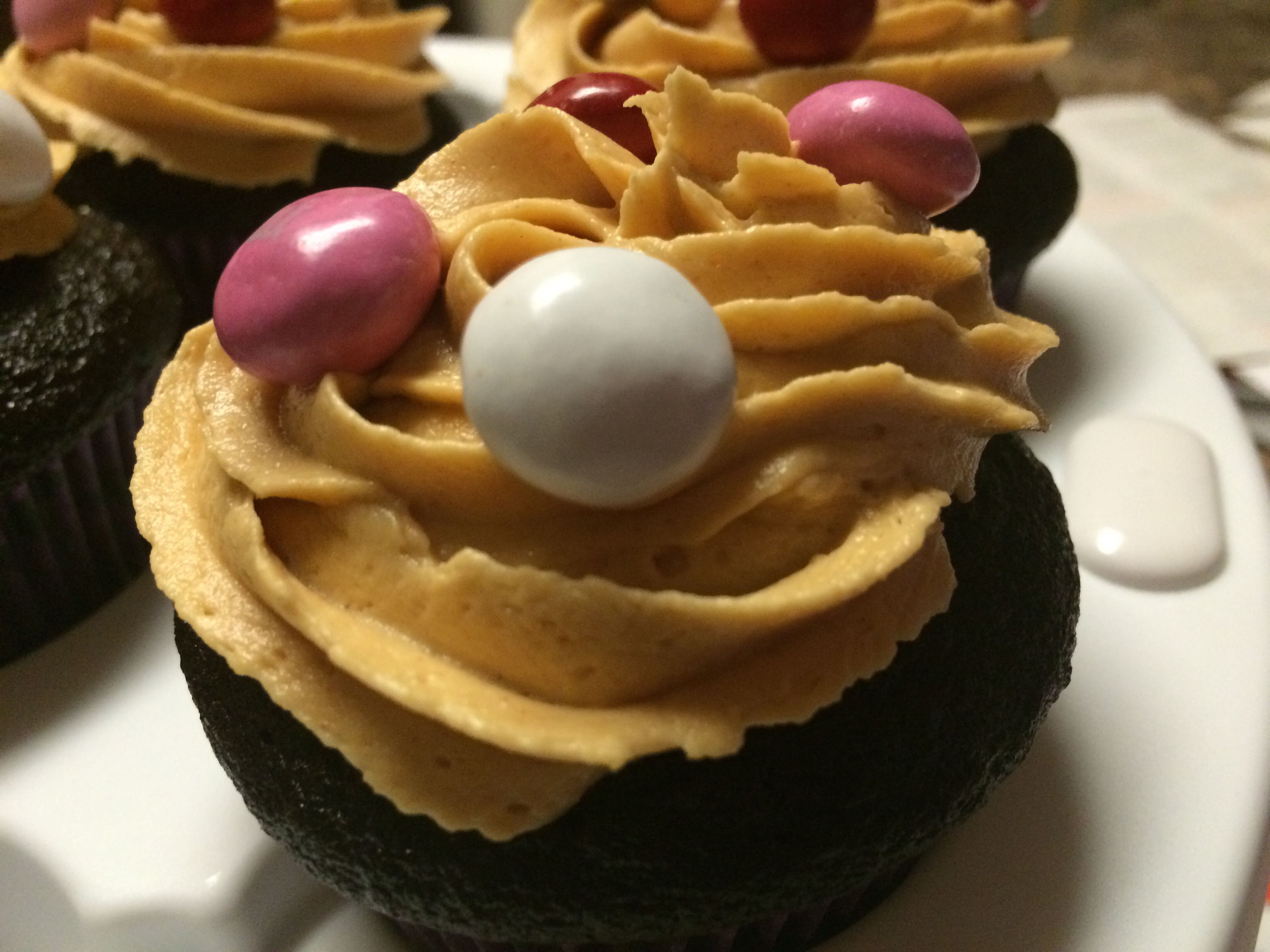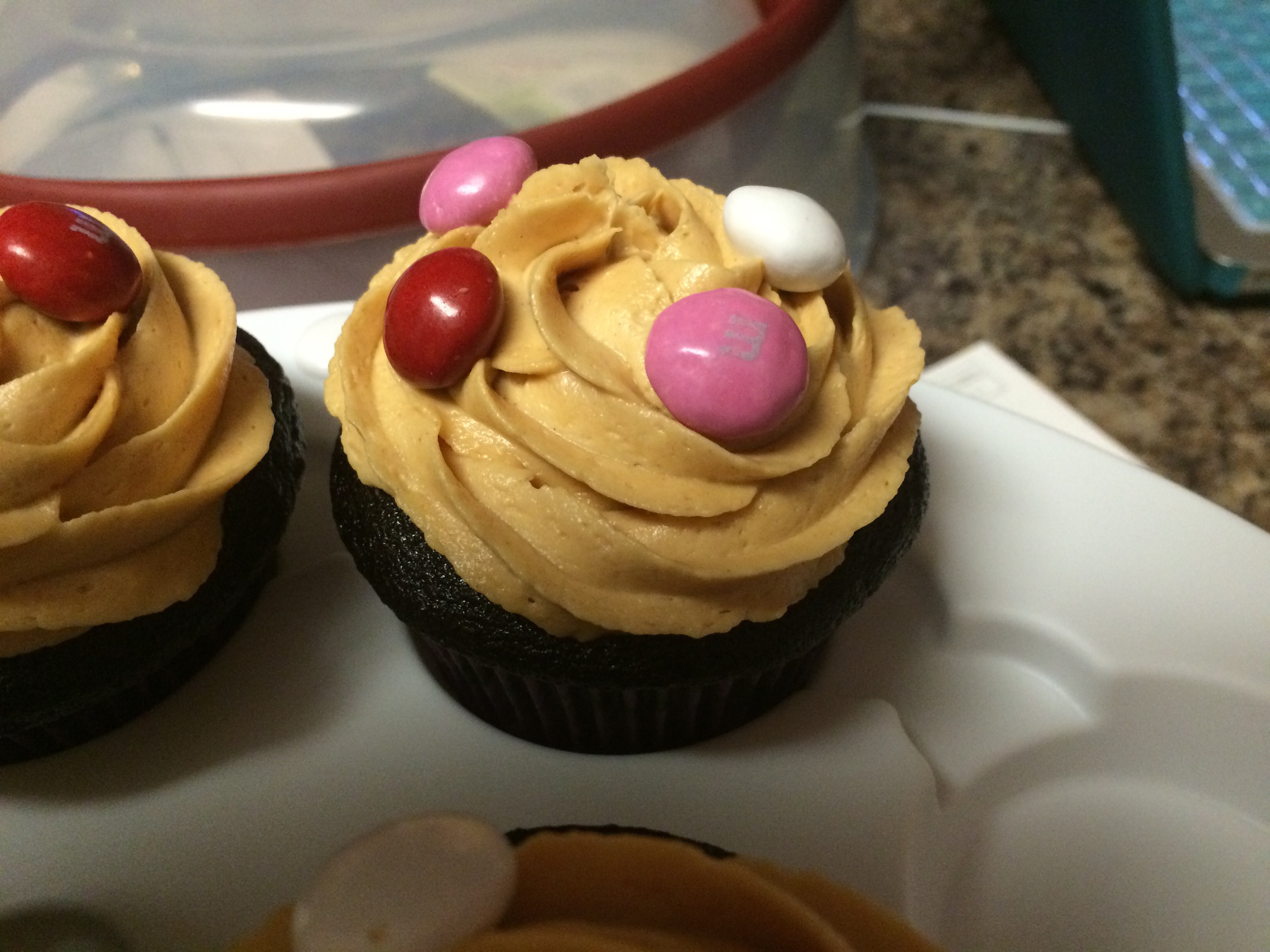 I used peanut butter frosting for these cupcakes but of course chocolate would work, too! Vanilla might even be ok if you want to dial down the chocolate a little bit. My favorite peanut butter frosting is from Sally’s Baking Addiction, and that link will take you directly to the post. I topped these off with some peanut butter M&Ms!