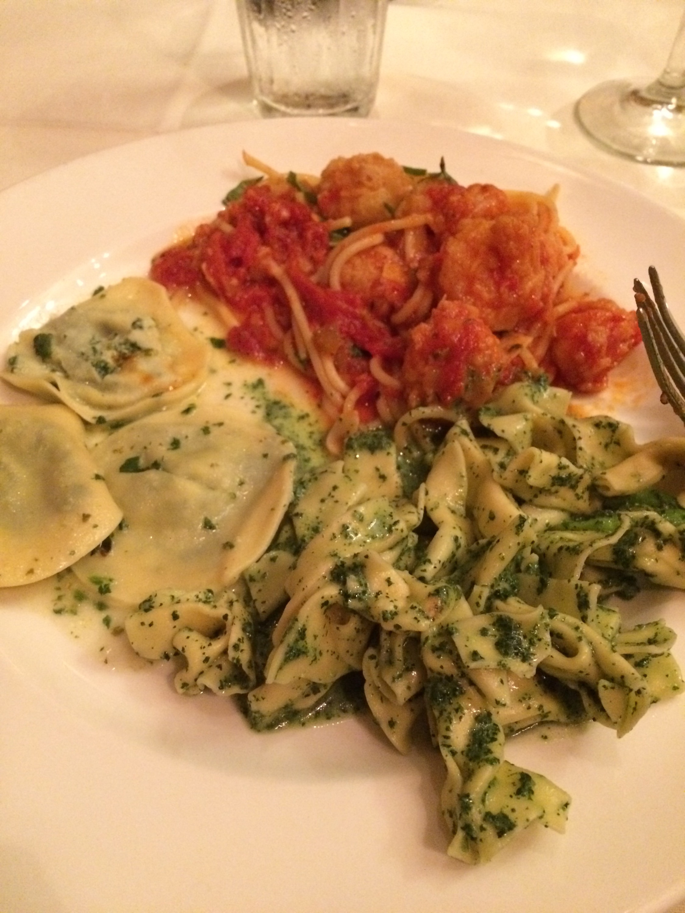 The way it worked was that there were three pastas of the night, which were continually brought around by waiters. You could have as much as you wanted of one, two, or all three pastas. Basically, it was heaven. The choices were spaghetti arrabiata with fried shrimp (top), farfalle with pesto (right), and spinach and cheese ravioli in a brown butter sauce (left). My favorite was the pesto, although I was surprised by the arrabiata. I never would have picked the spicy sauce, but it was good!
