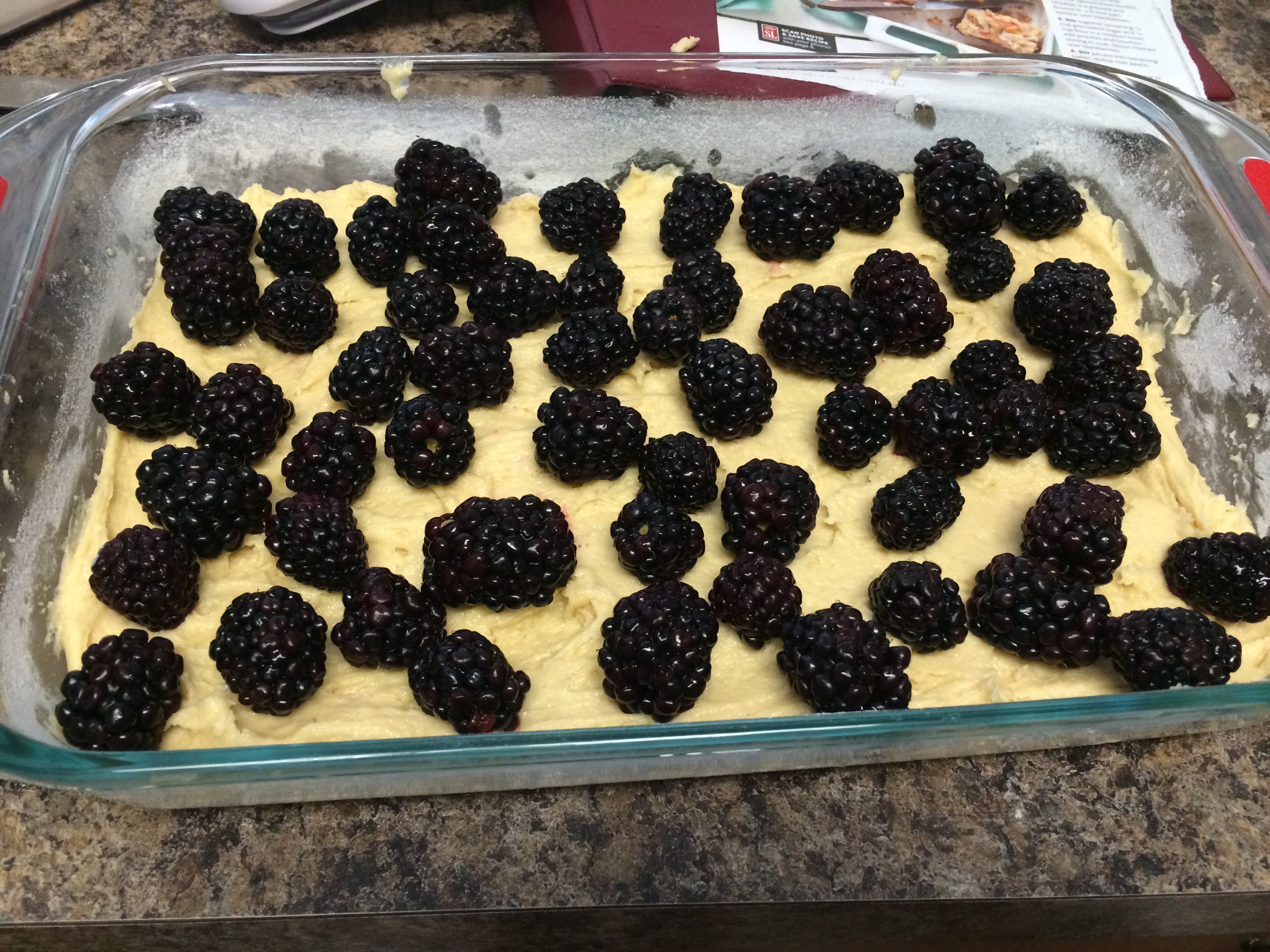 Spread 3/4 of the batter into a greased and floured 9×13 inch pan, then place the blackberries on top. The batter is quite thick and difficult to spread, so don’t worry about making it completely even. Just do the best you can!