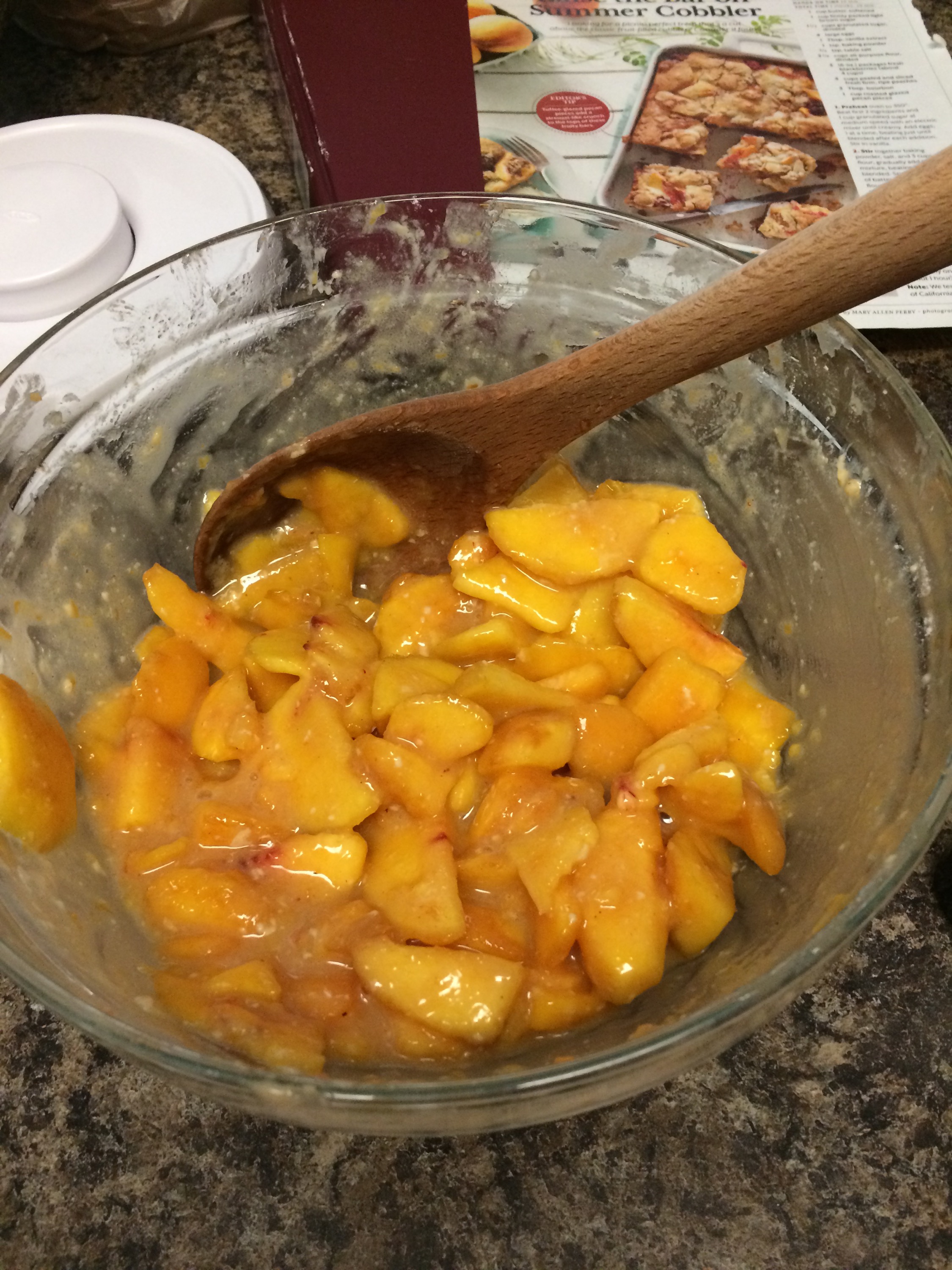 Once the pecans are done, stir them into the remaining batter. Then spread the batter on top of the cobbler. Again, it will be a bit difficult, so don’t worry about making it perfect. Clearly, mine isn’t!