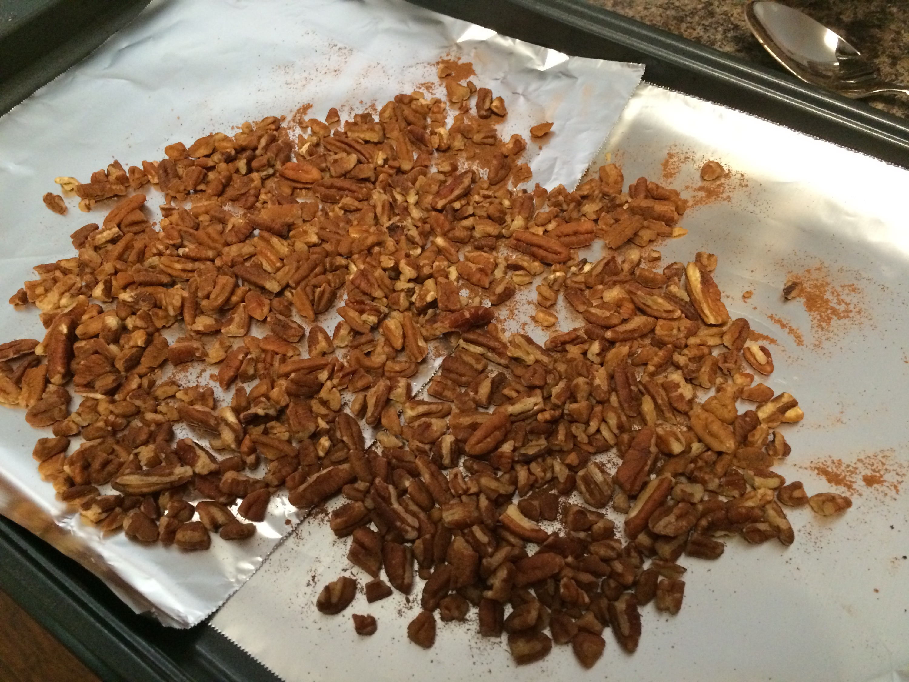 Add 1 tsp cinnamon to the pecans and spread them on a cookie sheet. Bake them in your preheated oven 5-10 minutes, until fragrant.