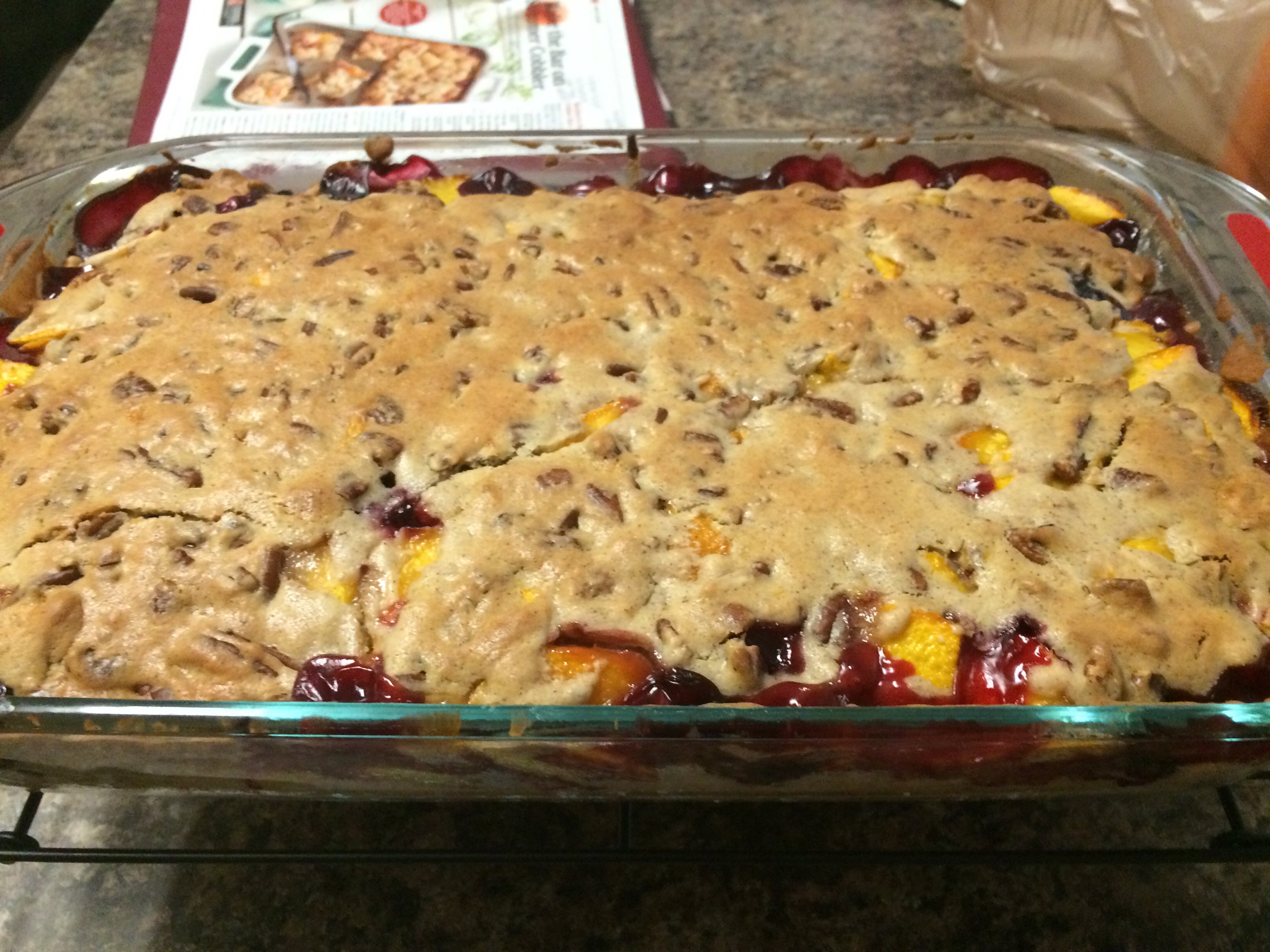 The fruits are sweet and juicy, and the pecans in the topping add a nice crunch to the whole thing. It’s like having pie and cake together!